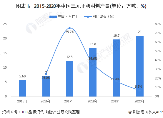 三元材料是鎳鈷錳酸鋰和鎳鈷鋁酸鋰為代表的多元金屬復合氧化物,是動力電池主要正極材料之一,主要用于乘用車以及大部分物流車。近年來,國內(nèi)三元材料產(chǎn)量增長勢頭略顯不佳。據(jù)鑫欏資訊統(tǒng)計,2015-2020年,中國三元正極材料產(chǎn)量呈逐年上升趨勢。2020年國內(nèi)三元材料累計產(chǎn)量約為21萬噸,同比增長6.6%,增速下滑明顯。