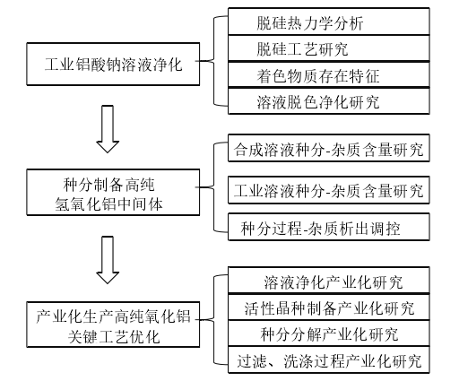 為了低成本制備高純氧化鋁粉體,有專家開展了以工業鋁酸鈉溶液為原料制備高純氧化鋁的研究。以工業鋁酸鈉溶液為原料,以脫硅熱力學為基礎,進行溶液的凈化脫色,研究種分分解過程,并對產業化流程進行優化改進,生產出高純氫氧化鋁中間體,經焙燒得到高純氧化鋁,其技術路線圖如下: