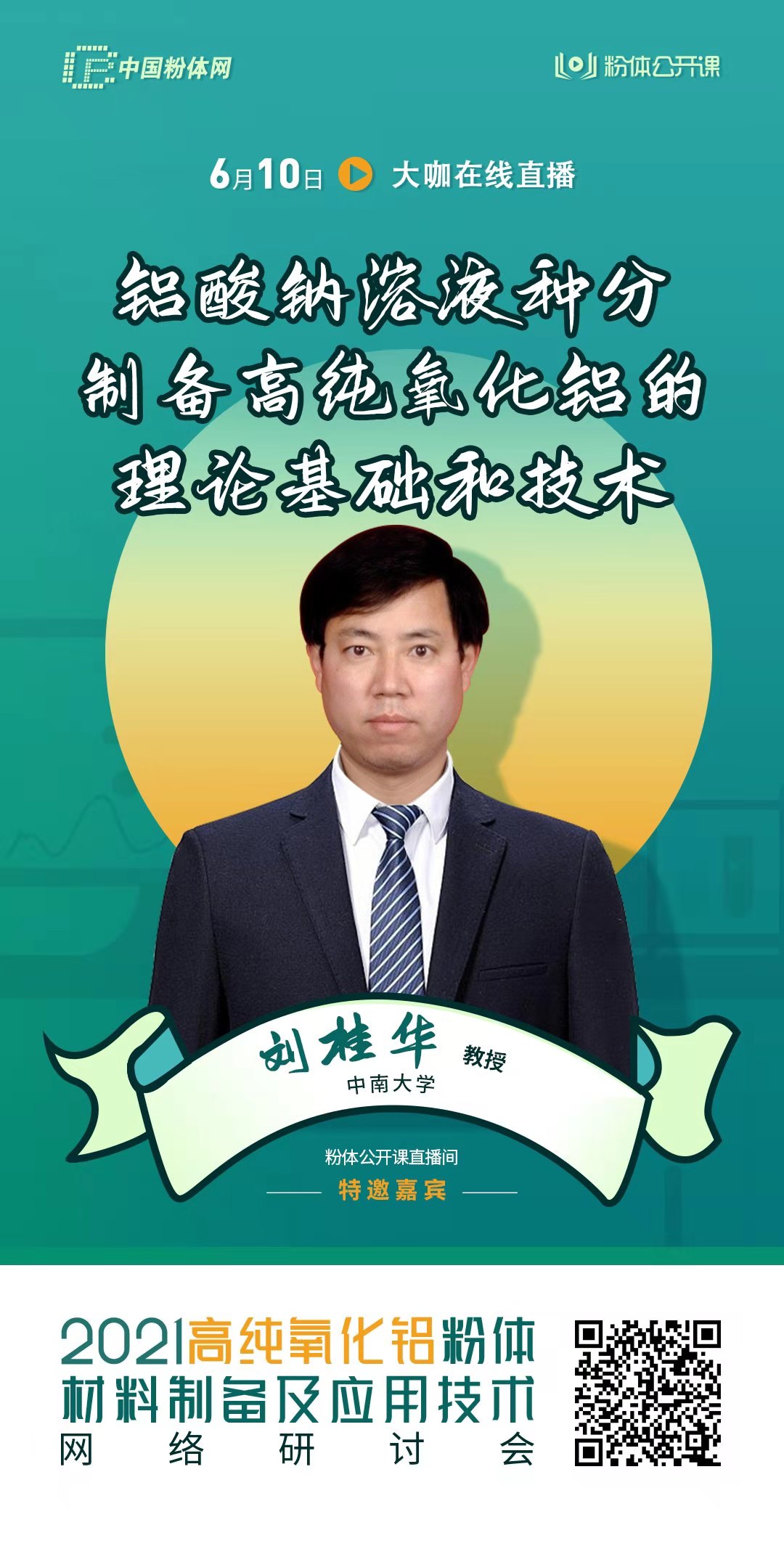對于氧化鋁企業,開發以工業鋁酸鈉溶液為原料制備高純氧化鋁,生產流程的溶液可在工業氧化鋁系統中循環使用,無廢液排除,安全環保;以鋁酸鈉溶液為鋁源,無需重新制備溶液,具有成本低的優勢。因此,以工業鋁酸鈉溶液為原料制備高純氧化鋁,具有成本優勢,研究制備過程相關理論和工藝,對企業轉型升級具有重要意義。中國粉體網旗下粉體公開課平臺將于2021年6月10日舉辦“2021高純氧化鋁粉體材料制備及應用技術網絡研討會”,來自中南大學的劉桂華教授將走進本次粉體公開課的直播間,給大家帶來題為《鋁酸鈉溶液種分制備高純氧化鋁的理論基礎和技術》的報告。屆時劉教授將向大家闡述高純氧化鋁的用途,提出解決高性能和高成本矛盾的技術路線;明確鋁酸鈉溶液種分過程中鋁酸根離子反應行為,分析粒子附聚和生長規律,闡明三水鋁石和勃姆石析出過程中形貌調控原理;以工業鋁酸鈉溶液制備了大于4N高純氧化鋁粉末,同時報告高白超細氫氧化鋁、勃姆石的產業化過程。最后,提出鋁酸鈉溶液制備高純氧化鋁粉的發展方向。