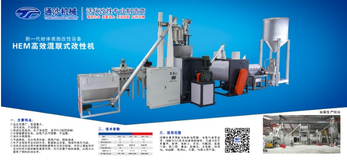 選用了無重力原理進行改性加工,粉體活化率大幅提高。由于采用了無重力原理工作,在添加改性劑配比極小(1-2%)的情況下,可使改性劑迅速均勻地與粉體(碳酸鈣)接觸,以實現高質活化之目的,粉體活化率可高達98%以上。同時,在配方程序上可靠避免了對橡塑原材料的首度加熱溶解老化,使得原料配方實現了高均勻度,為下一造粒工序產品質量奠定了堅實的基礎,大幅度提升了母粒的產品質量,有效地降低了生產成本。