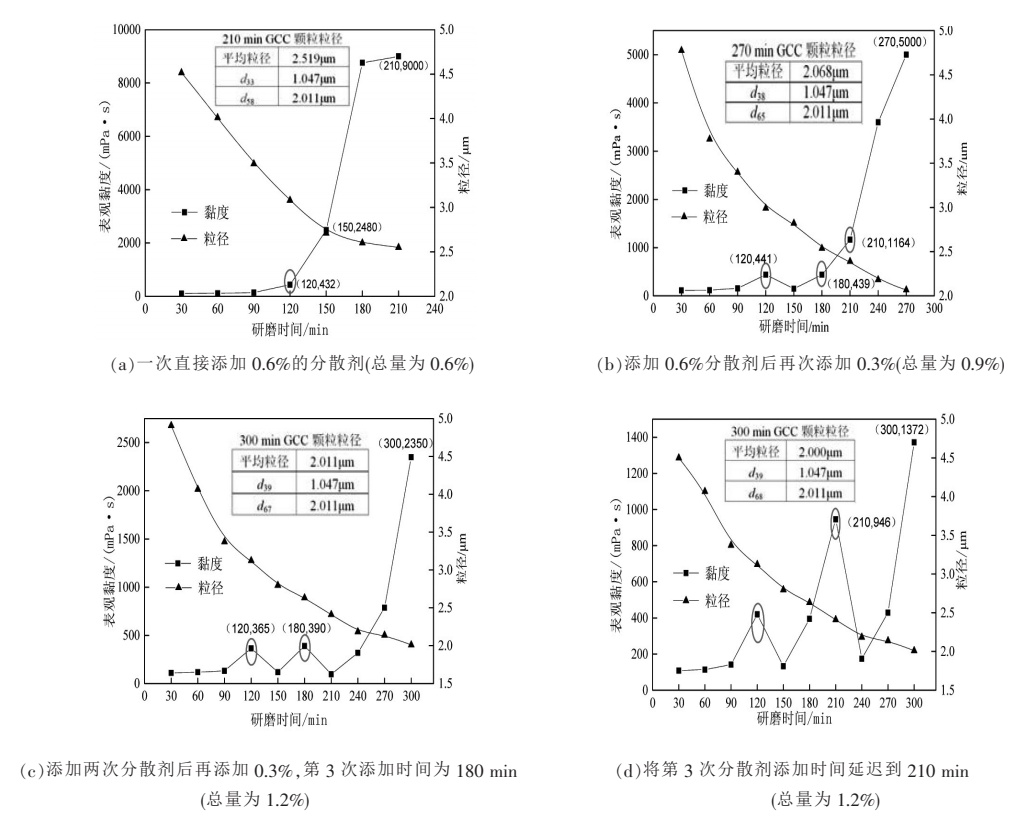 1、研磨過程分散劑添加方式對碳酸鈣研磨效果的影響