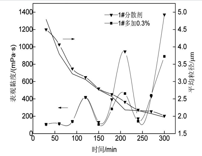 觀察圖2得知:在碳酸鈣研磨過程中,分段多次加入分散劑有助于減小產品粒徑,并可以持續降低其表現黏度;此外,分散劑加入時,添加時間的選擇需要精準把握,可減少分散劑用量,提高產品質量穩定性。