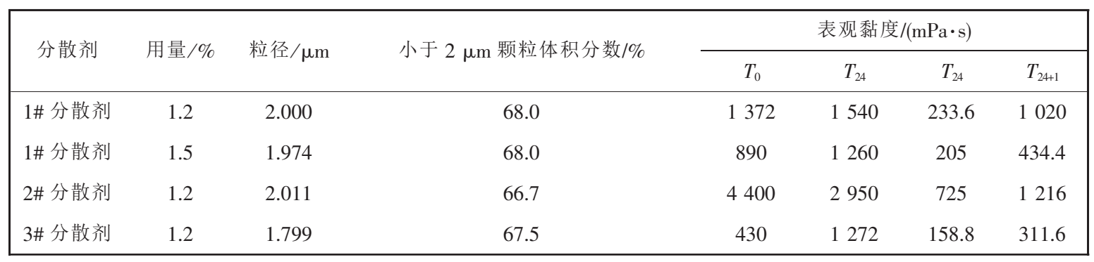 為驗證自制分散劑對研磨碳酸鈣研磨分散性能,與市售兩種產品進行了對比應用,2#、3#分散劑均由國內某代理公司提供,其中2#由日本某企業、3#為德國某企業生產。