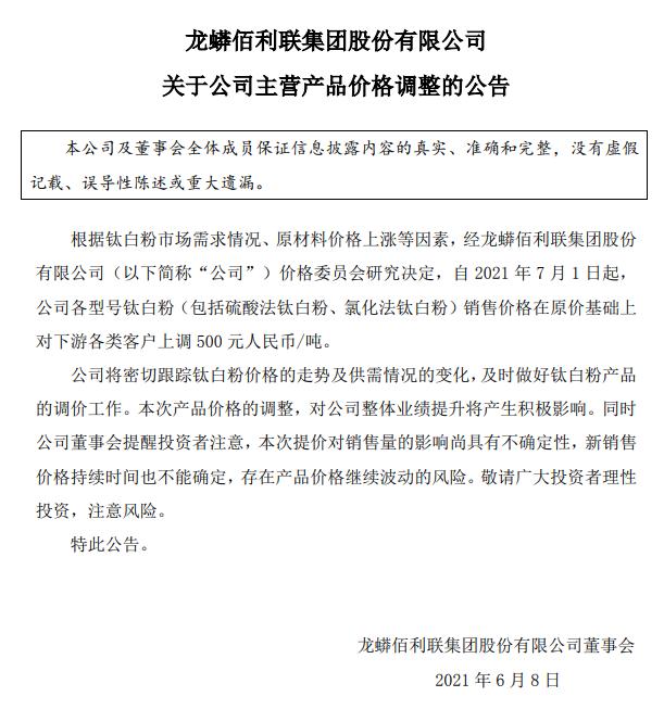 中國粉體網訊 龍蟒佰利6月8日晚間發布公告稱,自2021年7月1日起,公司各型號鈦白粉(包括硫酸法鈦白粉、氯化法鈦白粉)銷售價格在原價基礎上對下游各類客戶上調500元人民幣/噸。