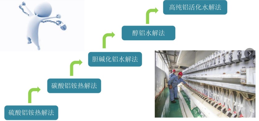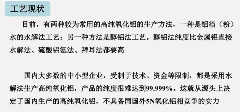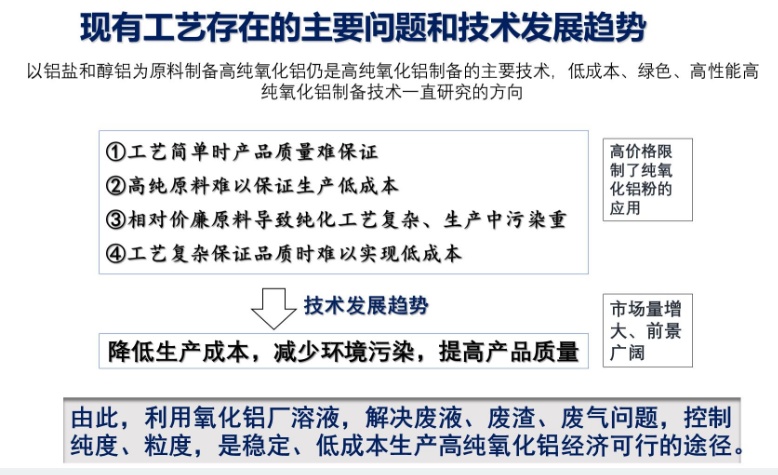 目前可生產高純氧化鋁的技術路線較多,已經實現產業化的生產技術主要有:改良拜耳法、有機鋁水解法、硫酸鋁銨法、活性鋁粉水解法、膽堿法。楊所長認為,這些方法的本質都是液相體系里面析出固相,最核心的還是析出過程中晶核長大的過程,固相的品質影響著高純氧化鋁的性能。
