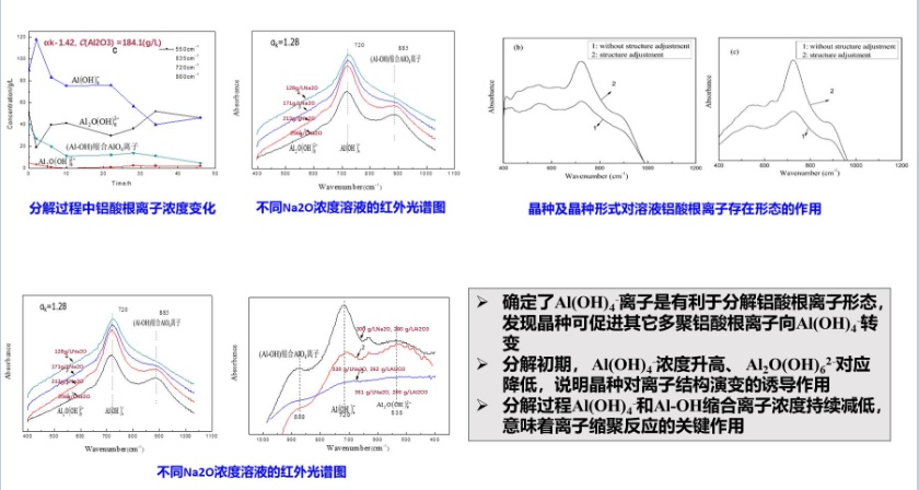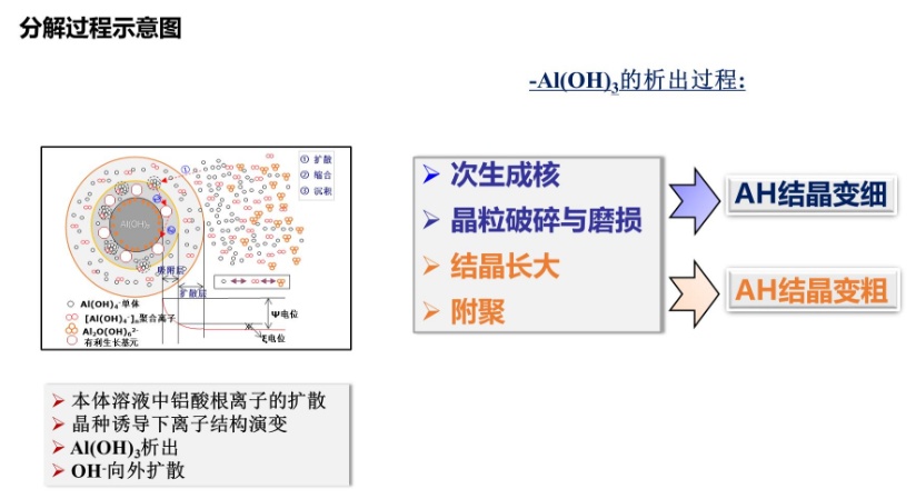 接下來,劉教授詳談了種分機理,明確鋁酸鈉溶液種分過程中鋁酸根離子反應行為,分析粒子附聚和生長規律,闡明三水鋁石和勃姆石析出過程中形貌調控原理;以工業鋁酸鈉溶液制備了大于4N高純氧化鋁粉末,同時報告高白超細氫氧化鋁、勃姆石的產業化過程。