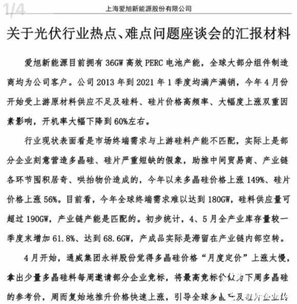 中國(guó)粉體網(wǎng)訊 對(duì)于近期的硅料價(jià)格高幅度拉升,行業(yè)企業(yè)接連漲價(jià)的背景之下,今日,愛旭股份發(fā)布一篇《關(guān)于光伏行業(yè)熱點(diǎn)、難點(diǎn)問題座談會(huì)的匯報(bào)材料》的文章,引發(fā)行業(yè)關(guān)注與熱議。