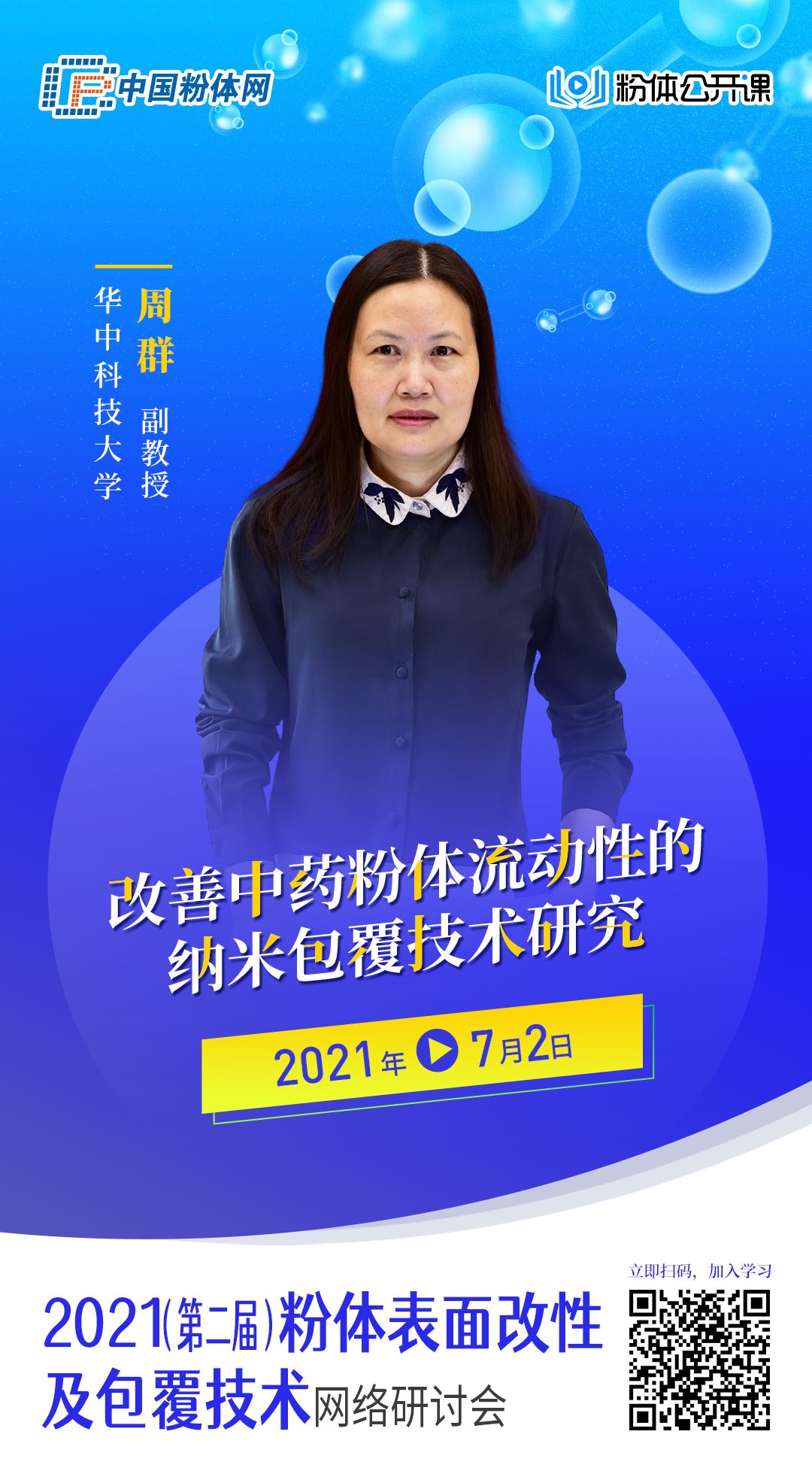 2020年,中國(guó)粉體網(wǎng)旗下平臺(tái)粉體公開課舉辦首屆粉體表面改性及包覆技術(shù)網(wǎng)絡(luò)研討會(huì),受到了業(yè)內(nèi)人士的諸多好評(píng)。2021年,中國(guó)粉體網(wǎng)平臺(tái)粉體公開課再出發(fā),于2021年7月2日,舉行“2021第二屆粉體表面改性及包覆技術(shù)網(wǎng)絡(luò)研討會(huì)”,特邀華中科技大學(xué)同濟(jì)藥學(xué)院周群副教授為大家作《改善中藥粉體流動(dòng)性的納米包覆技術(shù)研究》專題報(bào)告,線上與大家分享改善中藥粉體流動(dòng)性的納米包覆技術(shù)研究成果。