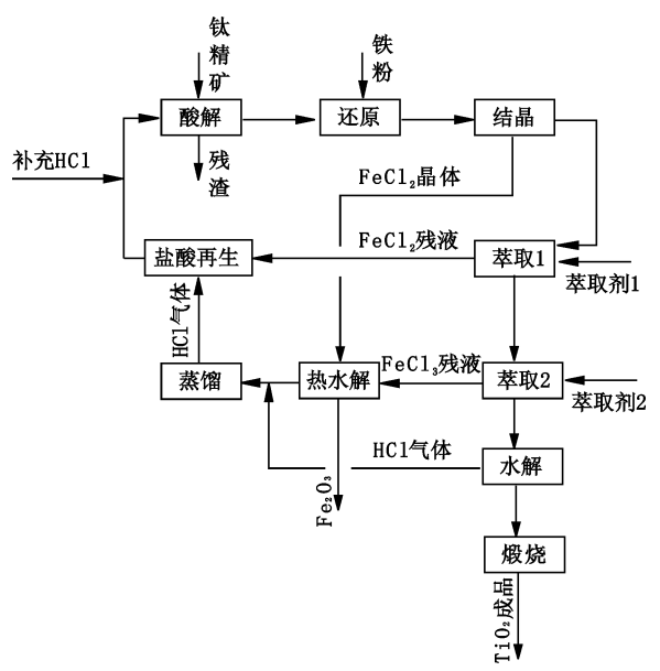 當鈦白粉產品的原料為鈦鐵礦時可采用鹽酸法,鹽酸法鈦白粉的生產過程主要包括酸解、還原、結晶、萃取、水解、煅燒、破碎以及鹽酸回收等工序。金紅石類鈦白粉最常應用鹽酸法,此類原料的顆粒較松軟,且粉碎性強,其整個生產流程都會完成在含氯介質內部。其工藝流程示意圖如圖3所示。