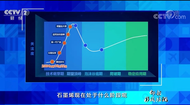 石墨烯現在處于什么階段呢?實際上我們認為還處于這樣一個階段:炒作的高峰漸漸過去了,市場也漸趨冷靜。現在盡管還有炒作的聲音,但實際上大家已經漸趨冷靜了。現在還不能說它會進入泡沫的谷底,但是需要有一段沉靜的時期,讓更多的人參與進來,去發展這個產業。最后才有可能真正走到最后,走到真正的大規模的應用,形成真正的石墨烯產業。