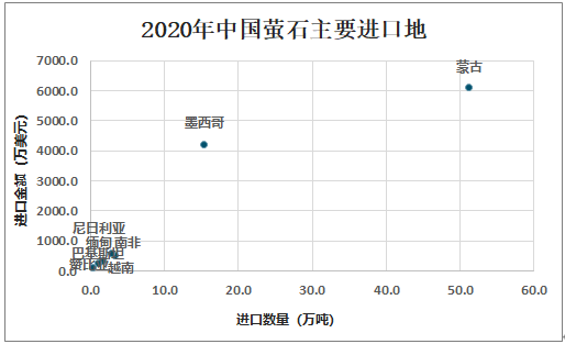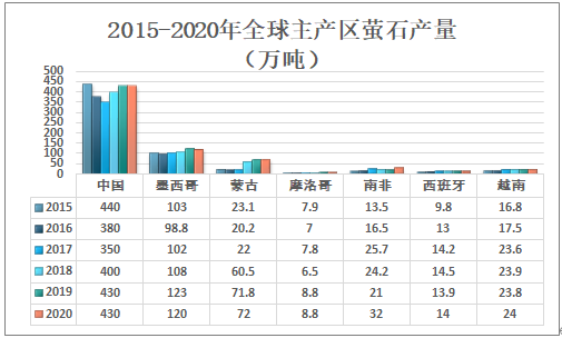 中國是全球最大的螢石產區,2020年中國螢石產量為430萬噸;其次為墨西哥,螢石產量為120萬噸;蒙古螢石產量為72萬噸,南非螢石產量為32萬噸,越南螢石產量為24萬噸。