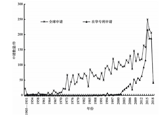 1905 年,Carborumdum 在碳化物先進(jìn)陶瓷材料燒結(jié)技術(shù)領(lǐng)域申請了第一件專利。1905—1970年,碳化物先進(jìn)陶瓷材料燒結(jié)技術(shù)全球?qū)@暾埩亢苌伲瑤缀踉?20 件以下。該時(shí)期為碳化物先進(jìn)陶瓷材料燒結(jié)技術(shù)的萌芽時(shí)期,技術(shù)研發(fā)處于探索階段。