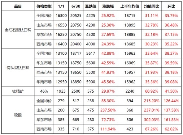 據了解,2021鈦白粉產業鏈上下游“業績”全面飄紅。上半年鈦精礦、硫酸及鈦白粉價格悉數呈現超20%的漲幅,同時同比2020年上半年、環比2020年下半年變動幅度均“飄紅”。