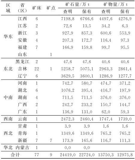 在77處礦床中,查明硅灰石礦石量2.44億t,保有硅灰石礦石量2.27億t。其中,超大型查明礦石量15062.2萬t,保有礦石量14890.7萬t;大型查明礦石量6592.8萬t,保有礦石量5400.2萬t;中型查明礦石量2303.4萬t,保有礦石量2031.3萬t;小型查明礦石量460.6萬t,保有礦石量401.8萬t。8個超大型礦床的資源儲量占全國的60%以上。