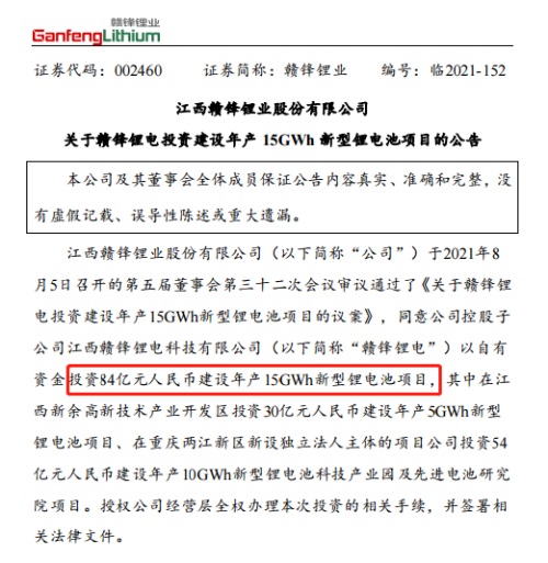 中國粉體網訊 8月5日,有“鋰王”稱號的贛鋒鋰業(002460.SZ)發布公告稱,同意公司控股子公司贛鋒鋰電以自有資金投資84億元,建設年產15GWh新型鋰電池項目。