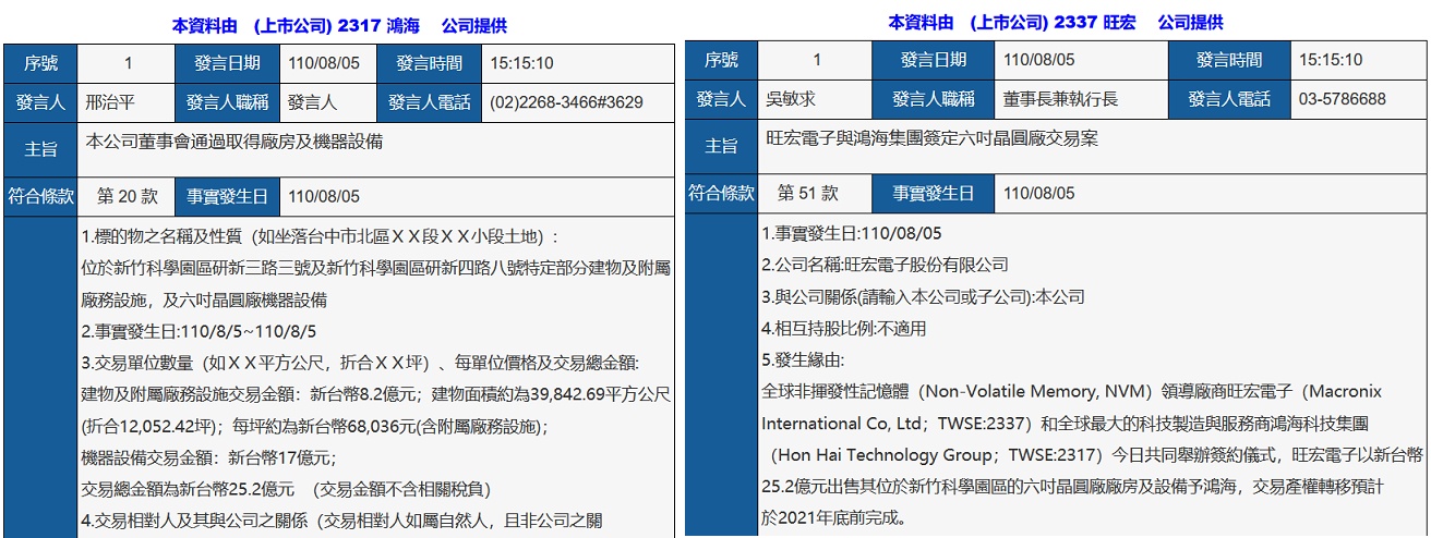 此次交易案由旺宏總經理盧志遠以及鴻海集團S事業群 (S Business Group) 總經理陳偉銘代表雙方公司簽署合約,劉揚偉及吳敏求共同見證,通過此交易,鴻海與旺宏也將展開進一步合作。