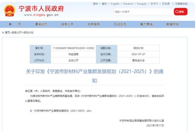 中國粉體網訊 7月27日,寧波市經信局發布《寧波市新材料產業集群發展規劃(2021-2025)》(以下簡稱《規劃》),寧波市是全國首批7個新材料產業國家高技術產業基地之一,產業規模全國領先。