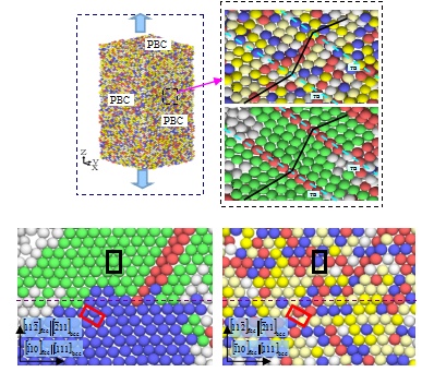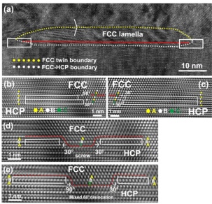 多主元高熵亞穩(wěn)材料因其新奇的結(jié)構(gòu)和優(yōu)異性能,是目前材料學(xué)屆的研究熱點。FCC高熵合金高的室/低溫塑性來源于密集納米孿晶的生成,但缺乏對孿晶生成過程和作用機制的認識。實驗室通過與英國鉆石光源合作,采用原位中子衍射和高分辨透射電鏡技術(shù),闡明了FCC高熵合金室/低溫拉伸和大塑性變形時納米孿晶和微帶共同作用的機制,提出了納米孿晶和微帶協(xié)同提高材料塑性的新材料設(shè)計理念;同時在國際上率先基于分子動力學(xué)構(gòu)建了高熵合金納米尺度變形模型,闡明了FCC→BCC的相變誘發(fā)塑性、變形誘導(dǎo)非晶化等機制。