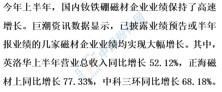 中國粉體網訊 8月21日,英洛華發布的半年度報告顯示,報告期內,公司實現營業收入163,124.16萬元,同比增長52.12%;歸屬于上市公司股東的凈利潤8,735.18萬元,同比增長23.63%。公司釹鐵硼磁性材料業務整體表現良好,實現營業收入95,684.28萬元,較去年同期增長60.92%。