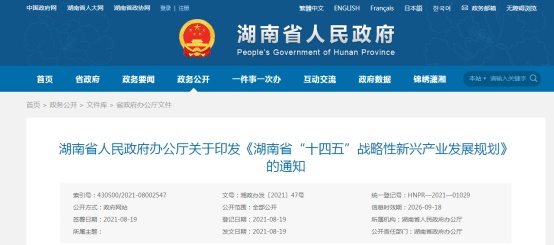 中國粉體網訊 近日,湖南省人民政府辦公廳印發《湖南省“十四五”戰略性新興產業發展規劃》(簡稱《規劃》),《規劃》強調要加快發展高端裝備、新材料、航空航天、新一代信息技術、生物、節能環保、新能源及智能網聯汽車、新興服務業和未來產業等九大產業。