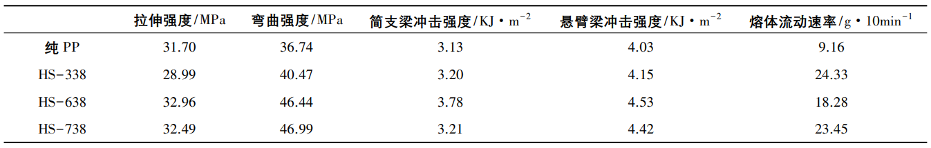 從表2可以看出,添加200份HS-738滑石粉,比純PP制備的復合材料的拉伸強度、彎曲強度、沖擊強度和熔融指數都得到了提高。采用HS-338,其粉體顆粒較粗,拉伸強度會下降;采用HS-638其粒徑分布比HS-738的要寬,其熔體流動性要差于HS-738。綜合考慮其力學性能和加工型,采用HS-738改性PP各項力學性能和加工性能最優。