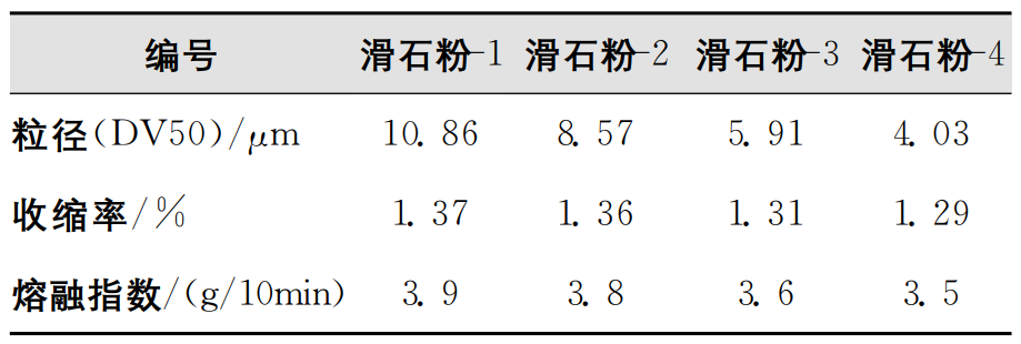 這主要是由于聚丙烯在冷卻時易結晶,造成收縮。滑石粉粒徑越小,比表面積越大,相同含量與滑石粉表面接觸越多,相較于粒徑較大的滑石粉,粒徑較小滑石粉可以有效阻止塑料材料的應力收縮,降低收縮率。