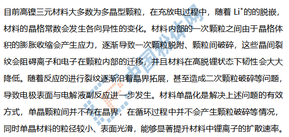 NCM三元材料雖然比容量較高,但存在循環(huán)性能差、倍率性能不佳等缺陷。造成這些缺陷的原因主要有:1)鋰離子擴(kuò)散系數(shù)較小,極化較大,電導(dǎo)率差;2)鎳鋰混排。Ni2+與Li+離子半徑相似,容易在燒結(jié)過程中占據(jù)彼此的位置,造成充電過程中鋰層中的Ni2+被氧化為Ni3+和Ni4+,但放電過程中鎳離子無法脫嵌造成較大的不可逆容量;3)鎳的含量越高,材料的堿性越大,材料表面的碳酸鋰會造成材料在高溫下脹氣,過多的氫氧化鋰造成材料堿性過高,使材料在勻漿過程中形成果凍狀,無法涂布。針對這些缺陷,研究學(xué)者們通過元素?fù)诫s、表面包覆、單晶化的方式對材料進(jìn)行改性。