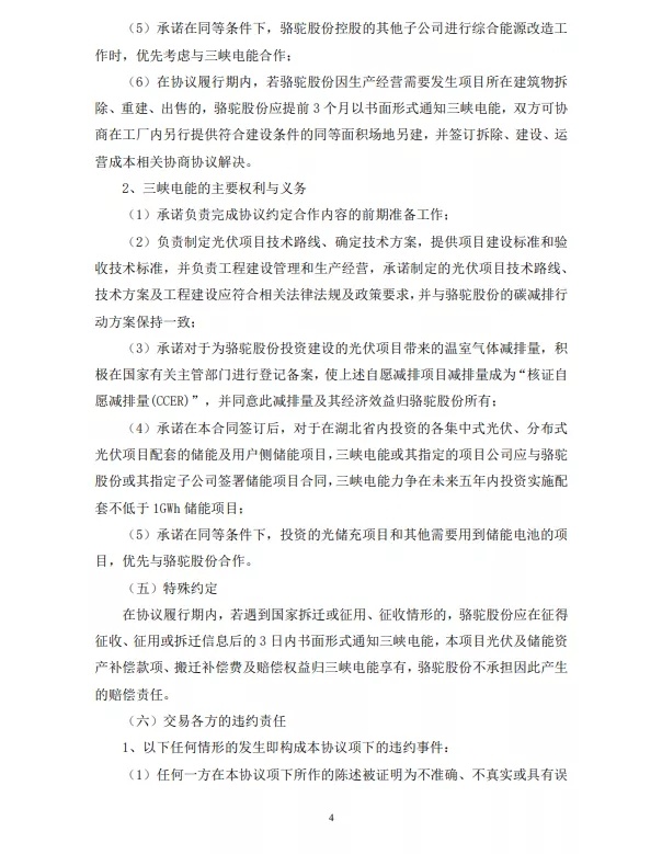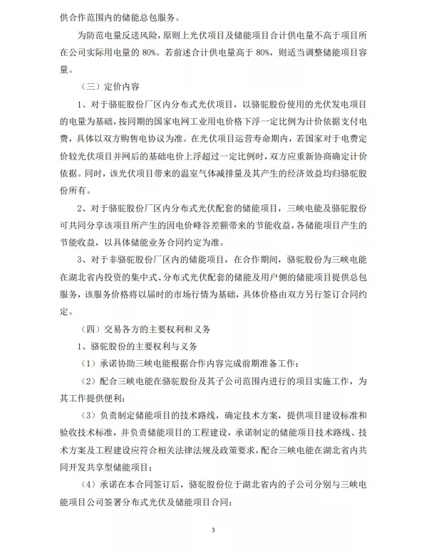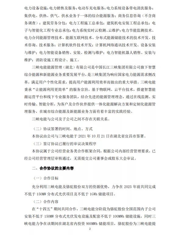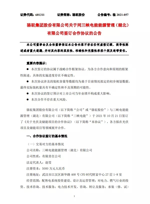 中國(guó)粉體網(wǎng)訊 10月22日,駱駝股份公布,公司與三峽電能能源管理(湖北)有限公司(“三峽電能”)于2021年10月21日簽訂了《關(guān)于光伏及儲(chǔ)能項(xiàng)目的合作協(xié)議》,各方擬在光伏項(xiàng)目及儲(chǔ)能項(xiàng)目等領(lǐng)域展開(kāi)合作。