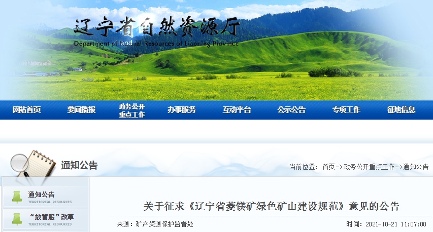 遼寧省自然資源廳發布《遼寧省菱鎂礦綠色礦山建設規范》(征求意見稿)