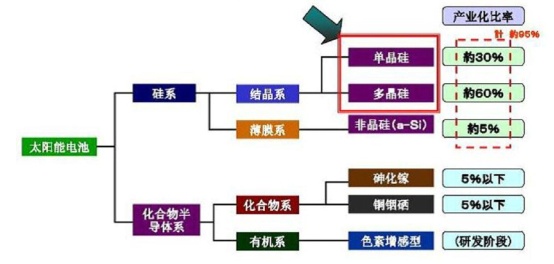太陽能電池作為一種清潔能源受到世界范圍內的廣泛重視。太陽能電池的主要分類如下圖所示,多晶硅的轉化效率及產量高,而且對原料要求相對較低,因此是產業化比率最高的材料。