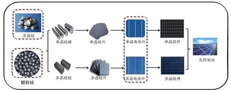 光伏發電靠光伏電池板,光伏電池板的主體是光伏電池片。光伏電池片可以用多晶硅材料,經直拉單晶爐拉制過程生成直拉單晶晶棒,或經鑄錠過程生成多晶/單晶鑄錠。直拉硅棒或鑄錠硅錠,經去皮、切方、切片、選片,制成光伏電池片,依工藝路徑分單晶電池片、多晶電池片/鑄錠單晶電池片,如下圖所示。