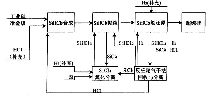 改良西門子法包括五個主要環節:SiHCl3合成、SiHCl3精餾提純、SiHCl3的氫還原、尾氣的回收和SiCl4的氫化分離。該方法通過采用大型還原爐,降低了單位產品的能耗。通過采用SiCl4氫化和尾氣干法回收工藝,明顯降低了原輔材料的消耗。