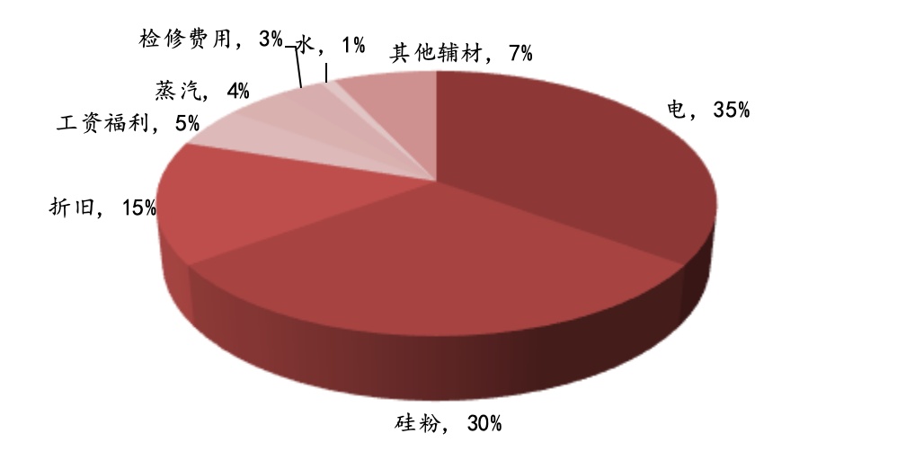 在當前主流多晶硅生產法-改良西門子法的生產成本中,電力成本、原料成本和折舊成本是主要部分,三者合計占到總成本的80%左右,其中電力成本占比最大,占比35%;硅粉成本占比30%;折舊成本占比達15%。因而,電力、原材料、折舊成為降低多晶硅生產成本的主要領域。