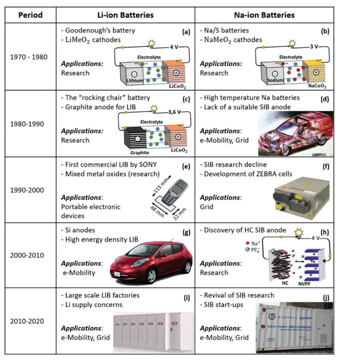 圖1 LIB 和 SIB 的共同歷史: a) Li//LiCoO2 電池的圖示。 b) Na//NaCoO2 電池的圖示。 c) 石墨//LiCoO2 電池的圖示。 d) 福特Ecostar的插圖,設計用于使用NaS電池。 e) 由LIB驅動的諾基亞3310便攜式設備。f) 用于電網儲能應用的商用ZEBRA電池。 g) 由LIB提供動力的 2010年 Nissan Leaf 模型。 h) 硬碳//Na3V2(PO4)2F3電池的圖示。 i) 網格規模的LIB安裝示意圖。 j) 在中國溧陽市安裝的中科海鈉 SIB。