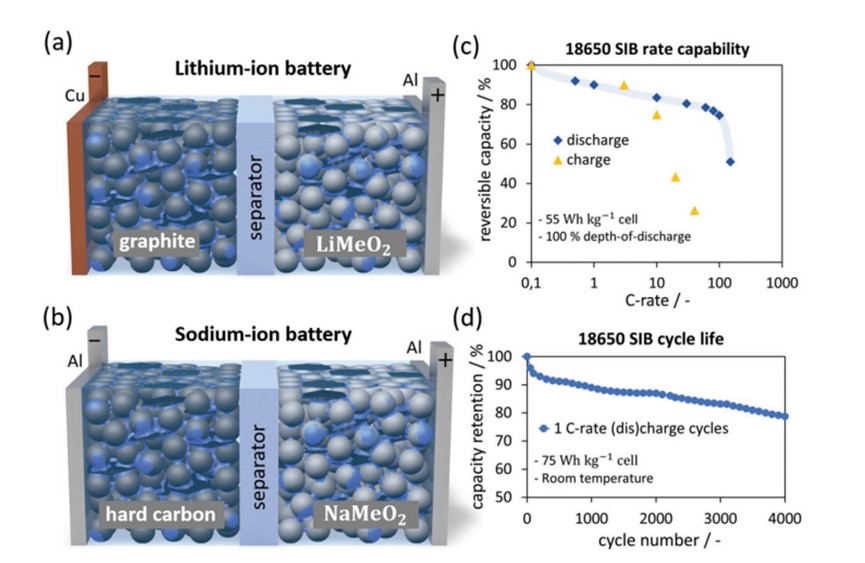 圖 2 a)鋰離子電池和 b)鈉離子電池的圖示,灰色球形為活性顆粒,黑色六邊形為碳導電填料,藍色為粘合劑。c)55Wh kg-1 SIB的倍率能力測試顯示出色的充放電率。d)SIB的延長循環壽命測試顯示在壽命結束前能夠進行約4000次循環。測試條件為室溫、1C速率和100% DoD下循環,電壓范圍為2~4.25V