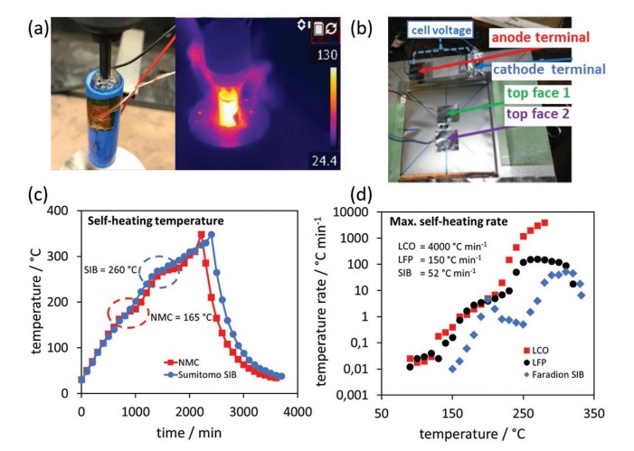 圖3 與商業LIB相比,SIB具有出色的熱穩定性和安全性。a) 圓柱形 SIBs 進行釘子穿透測試。b)在釘刺試驗后顯示無火焰的帶有四個熱電偶的SIB軟包電池。c)與NMC相比,SIB的ARC測試顯示SIB的自熱溫度較高。d)與LCO和LFP相比,SIB的ARC測試顯示SIB的自熱率較低。
