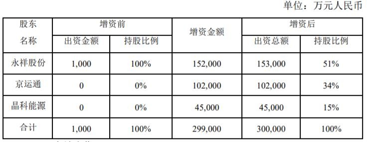 據悉,此次永祥股份、京運通、晶科能源三方合作,將以現金方式向項目公司進行注資,使項目公司注冊資本由1000萬元人民幣增加至30億元人民幣,其中永祥股份以貨幣增資15.2億元,京運通以貨幣增資10.2億元,晶科能源以貨幣增資4.5億元,增資擴股前后項目公司股本結構如下: