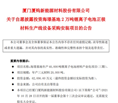 中國粉體網訊 近日,廈鎢新能公告,為發揮規模效應,滿足下游市場需要,廈門廈鎢新能源材料股份有限公司(以下簡稱“廈鎢新能”)擬在募投項目建設的同時,投資6.2億元,啟動海璟基地三期項目的建設,進行海璟基地2萬噸鋰離子電池高鎳三元正極材料生產線設備采購安裝項目,項目計劃于2021年10月啟動,2022年7月投產。