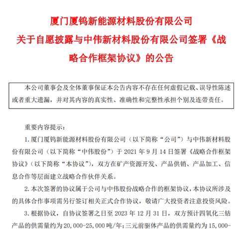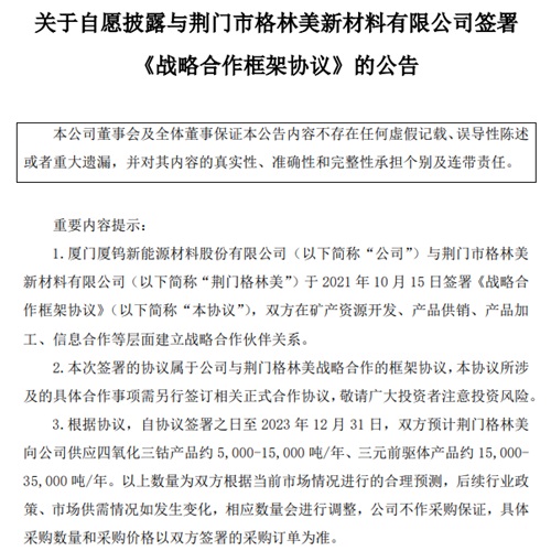 10月15日,廈鎢新能與荊門市格林美新材料有限公司(以下簡稱“荊門格林美”)簽署《戰略合作框架協議》,雙方在礦產資源開發、產品供銷、產品加工、信息合作等層面建立戰略合作伙伴關系。根據協議,自協議簽署之日至2023年12月31日,雙方預計荊門格林美向廈鎢新能供應四氧化三鈷產品約5,000-15,000噸/年、三元前驅體產品約15,000-35,000噸/年。