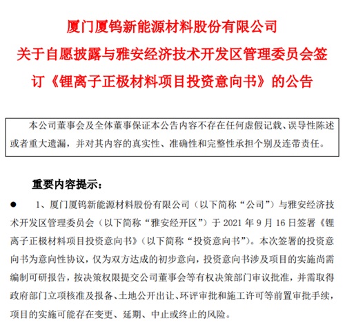 9月16日晚間,廈鎢新能公告,公司與雅安經開區簽署了《鋰離子正極材料項目投資意向書》。廈鎢新能計劃在雅安經開區投資建設鋰離子正極材料項目,預計投資意向不低于100億元,投資建設10萬噸磷酸鐵鋰、6萬噸三元材料等項目。