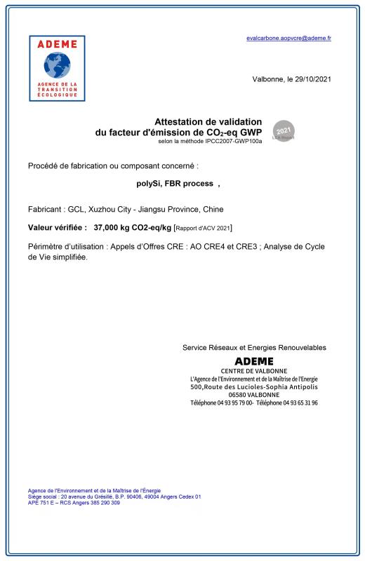 10月27日,保利協鑫在取得中國第一張顆粒硅碳足跡認證證書的基礎上,又拿到了由法國環境與能源控制署頒發的《GCL顆粒硅產品碳足跡證書》,證明該公司每生產1千克顆粒硅的碳足跡數值為37.000千克二氧化碳當量,大大刷新了此前由德國瓦克公司創造的全球“最低”——每功能單位57.559千克二氧化碳當量紀錄。該證書是迄今我國在顆粒硅方面獲取的由國外權威機構認證的首張“碳足跡身份證”,標志著我國顆粒硅在碳排放大數據方面具備了領跑全球太陽能行業的絕對優勢。