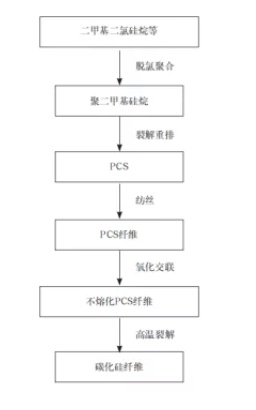 先驅體轉化法由日本東北大學矢島教授等人于1975年研發,主要包括先驅體合成、熔融紡絲、不熔化處理與高溫燒結四大工序,是目前比較廣泛的一種方法,技術相對成熟、生產效率高、成本低,適合于工業化生產。先驅體轉化法制備原理是將含有目標元素的高聚物合成先驅體——聚碳硅烷(PCS),再將先驅體紡絲成有機纖維,然后通過一些列化學反應將有機纖維交聯成無機陶瓷纖維。