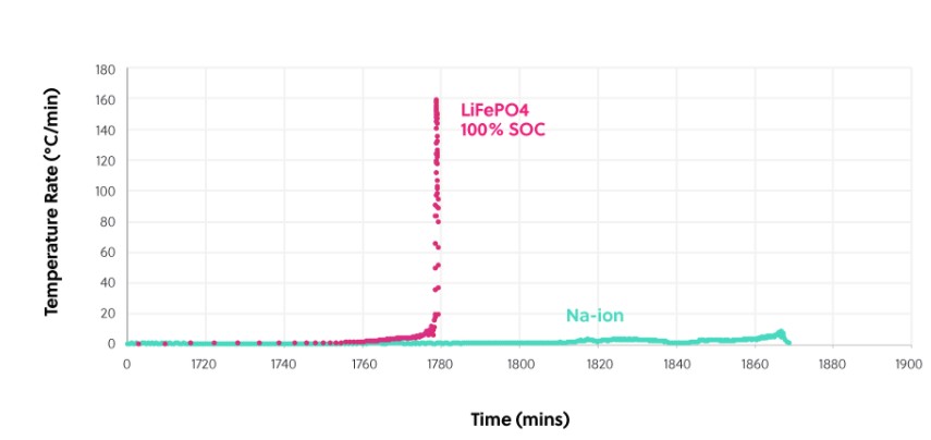 圖:0V(0%容量)下鈉離子電池的熱輸出,以及在相同條件下滿電的鋰離子電池(100%容量)的熱輸出對(duì)比。鋰離子電池產(chǎn)生的熱量是鈉離子電池的15倍以上。