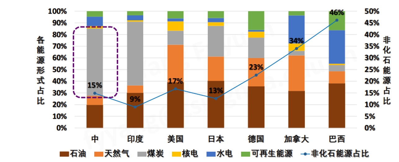世界部分國家能源比例構成(來源:徐傳偉.固體氧化物燃料電池及其產業化技術)