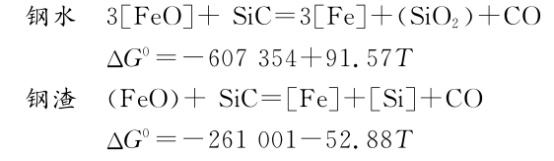 SiC可以作為爐外精煉脫氧劑。精煉爐脫氧和電爐還原期脫氧都屬于擴散脫氧,根據分配定律:在一定的溫度下,氧在熔渣中與鋼水中的溶解度是平衡的,FeO在渣與鋼液中的質量分數比是個常數。當SiC加入到渣層表面時,渣中的FeO含量降低,平衡被破壞,為了保持在此溫度下的分配常數,鋼中氧必向渣中擴散,從而降低了鋼中的氧含量,達到鋼液脫氧的目的。