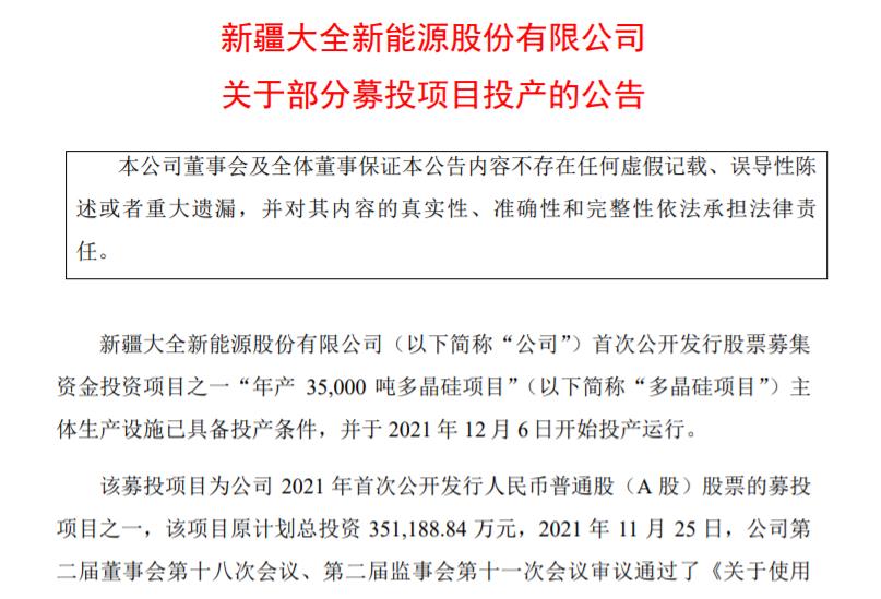 大全能源表示,年產3.5萬噸多晶硅項目的投產,有利于提高公司市場占有率,進一步增強公司在國內高純多晶硅行業的競爭力,并對公司的經營業績帶來積極影響。
