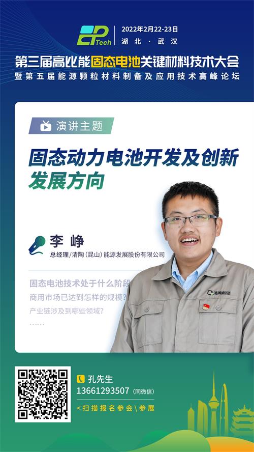 為促進(jìn)行業(yè)交流,2022年2月22-23日,由中國(guó)粉體網(wǎng)主辦的“第三屆高比能固態(tài)電池關(guān)鍵材料技術(shù)大會(huì)”將于湖北武漢東方建國(guó)大酒店舉辦,屆時(shí)將邀請(qǐng)來(lái)自清陶(昆山)能源發(fā)展股份有限公司的李崢總經(jīng)理作《固態(tài)動(dòng)力電池開(kāi)發(fā)及創(chuàng)新發(fā)展方向》報(bào)告。報(bào)告基于主講人清陶多年固態(tài)電池開(kāi)發(fā)經(jīng)驗(yàn)和近年來(lái)與各新能源汽車整車企業(yè)進(jìn)行產(chǎn)品方案設(shè)計(jì)和測(cè)試的經(jīng)驗(yàn)。針對(duì)動(dòng)力電池用戶需求,主講人將介紹固態(tài)電池在新能源汽車領(lǐng)域應(yīng)用的研發(fā)思路和開(kāi)發(fā)方向;并從材料+裝備+工藝的多維度角度入手,介紹清陶在固態(tài)動(dòng)力電池領(lǐng)域的產(chǎn)品開(kāi)發(fā)進(jìn)展。