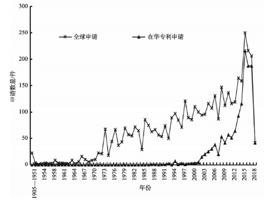 1905—1970年,碳化物先進陶瓷材料燒結技術全球專利申請量很少,幾乎在20件以下。該時期為碳化物先進陶瓷材料燒結技術的萌芽時期,技術研發處于探索階段。