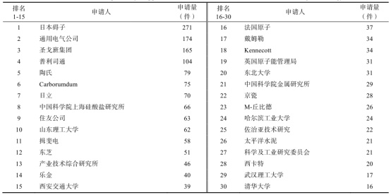 碳化物先進陶瓷材料燒結技術全球前30主要申請人排名