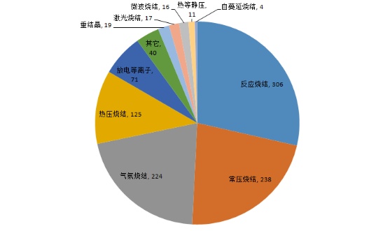 可以看出,反應燒結的專利申請量最多,共306項;其次是常壓燒結、氣氛燒結、熱壓燒結、放電等離子燒結等,其專利申請量分別為238項、224項、125項及71項。